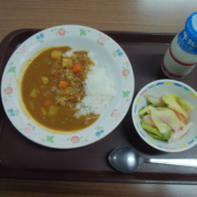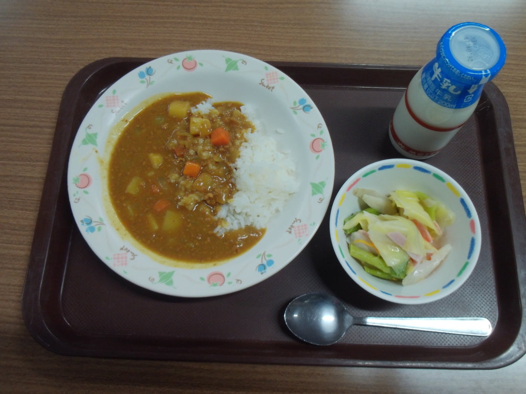 今日の給食は、カレーライス、春野菜のサラダ、牛乳でした(牛乳は基本的に毎日出ます)。